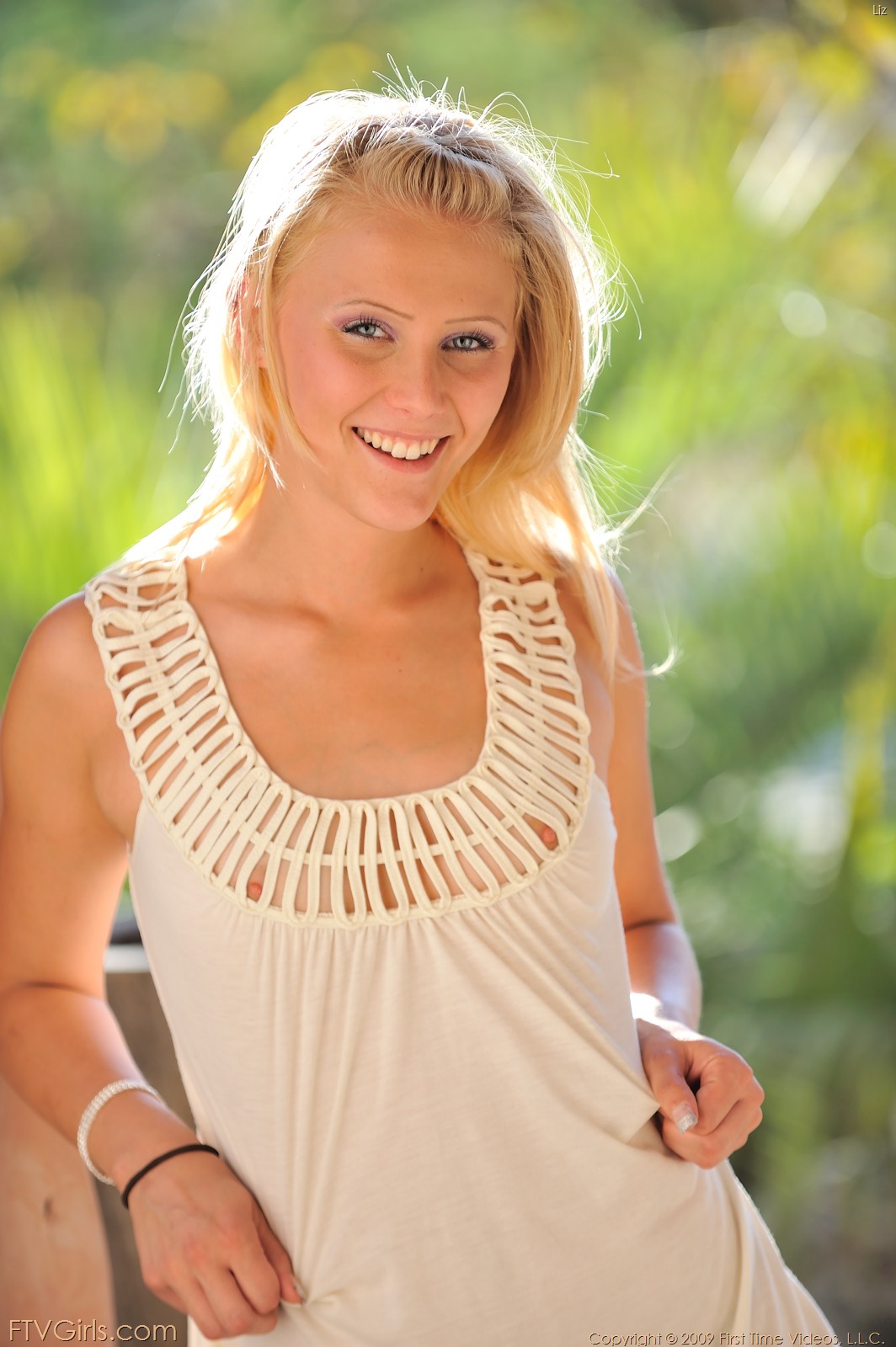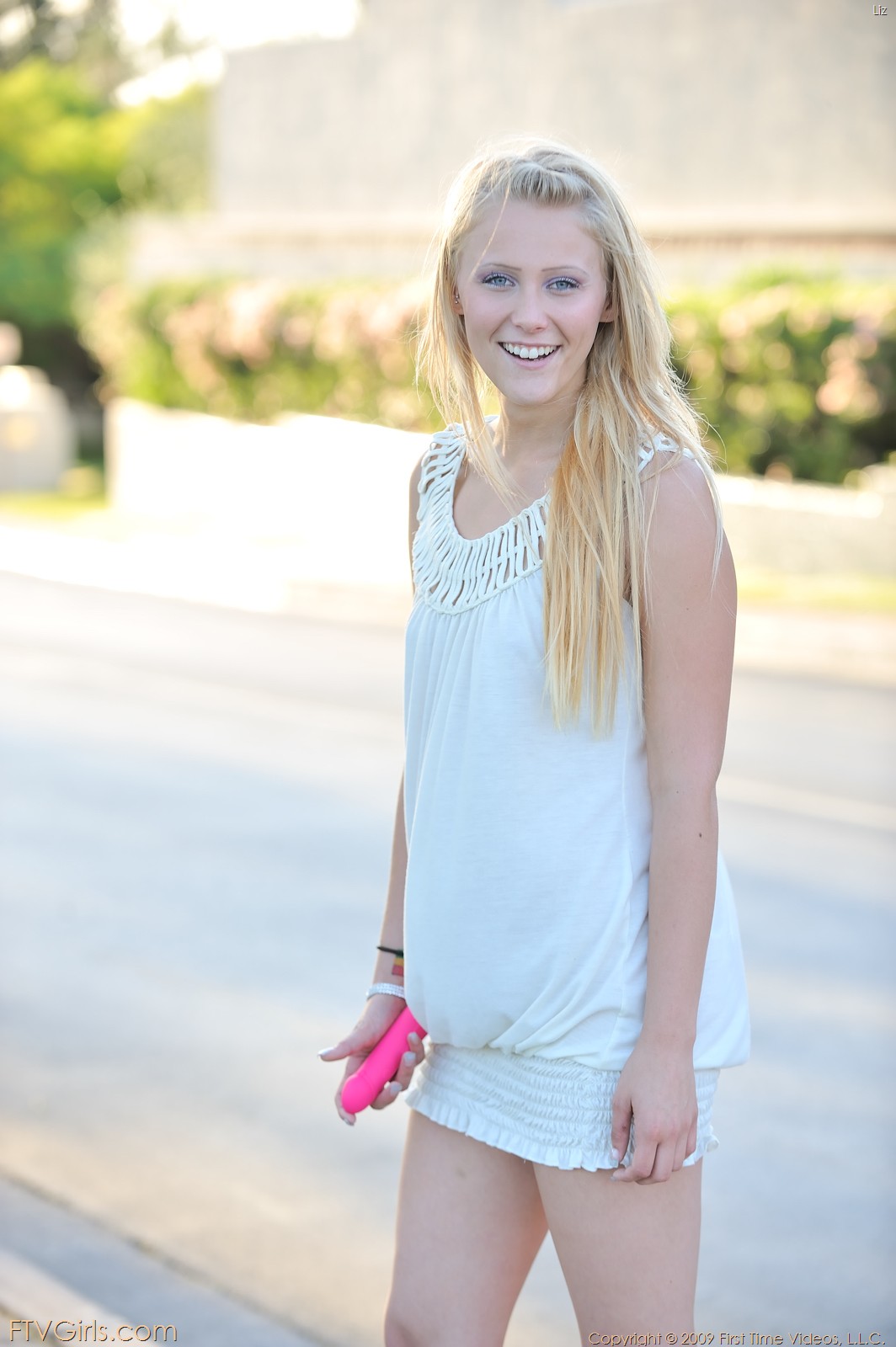 Cute solo babe, Kelli Stone gets off her white dress and shows her tits and pussy.
