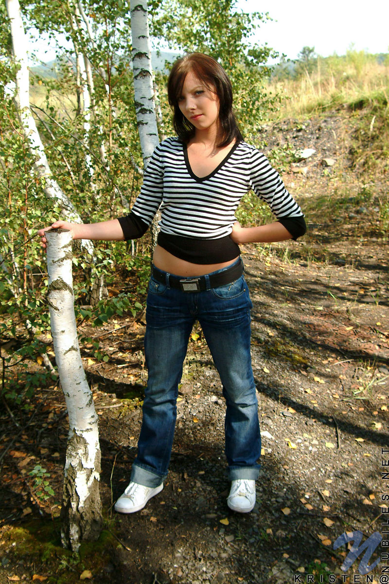 Kristen Nubiles takes her blue jeans outdoors and then fingers her gaping hungry muff.