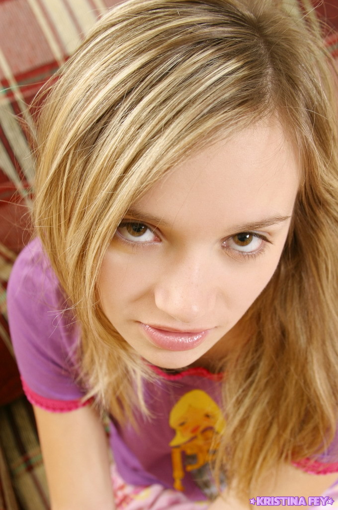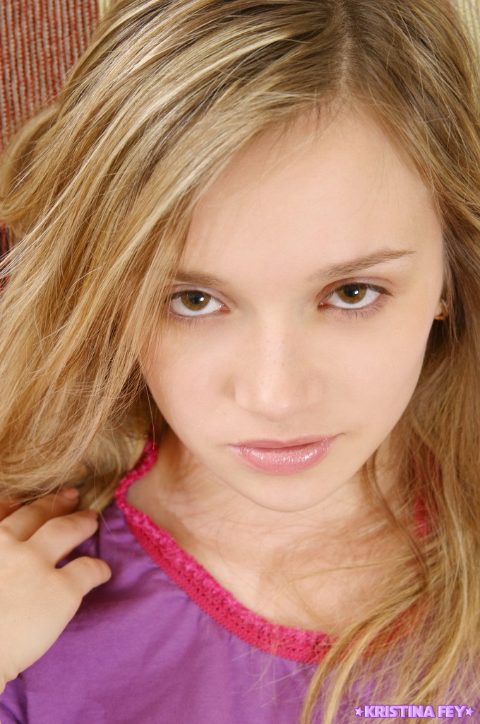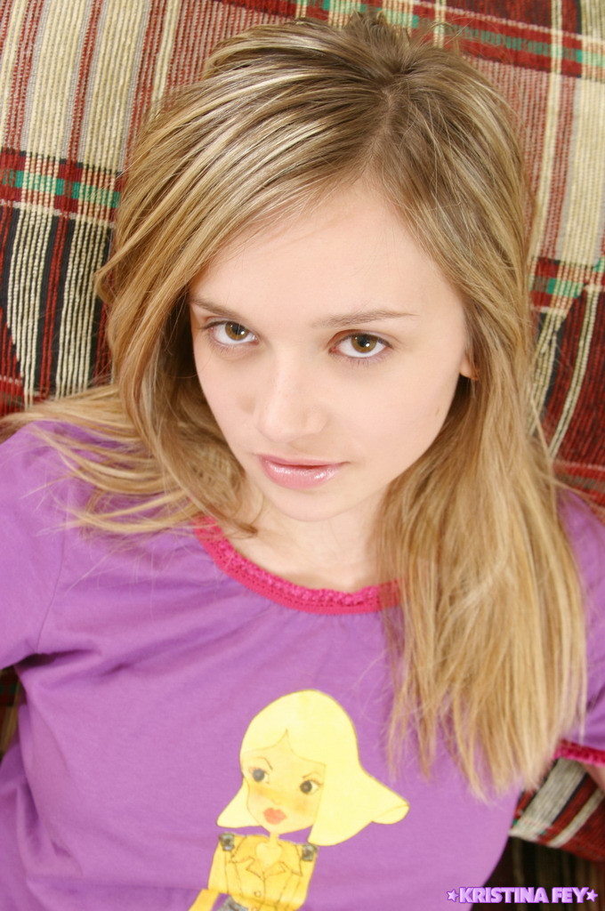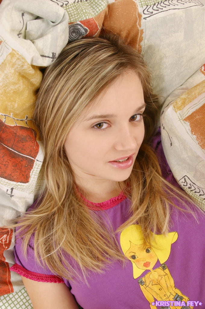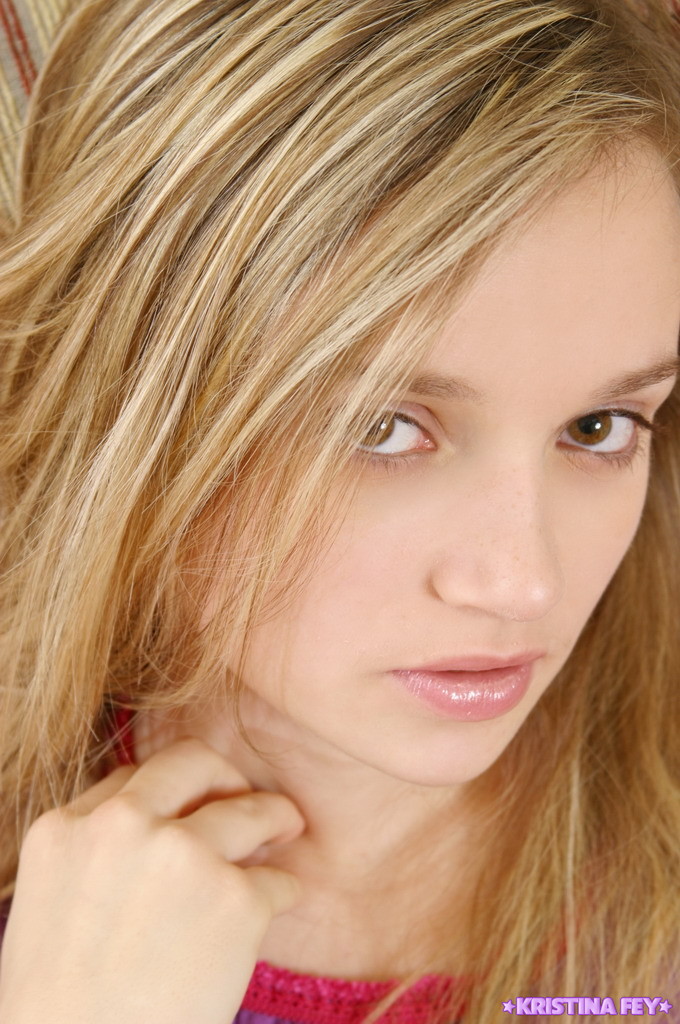 Beautiful blonde model Kristina Fey strips her underwear and shows her teen body.