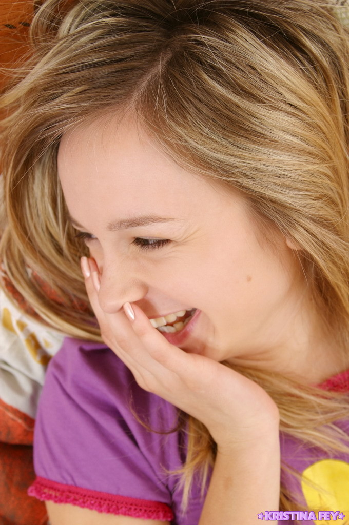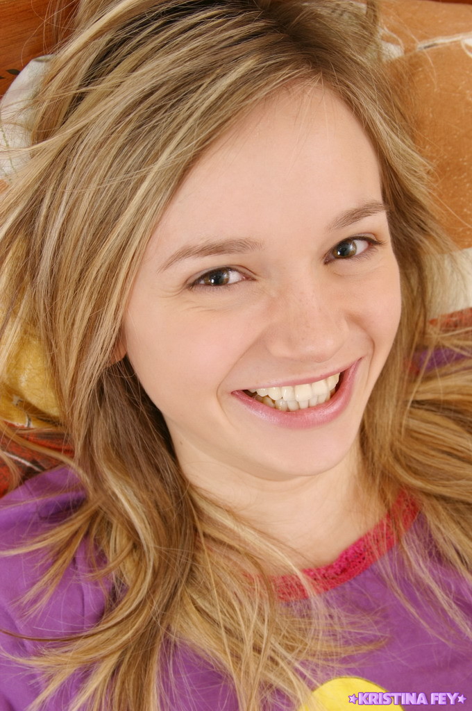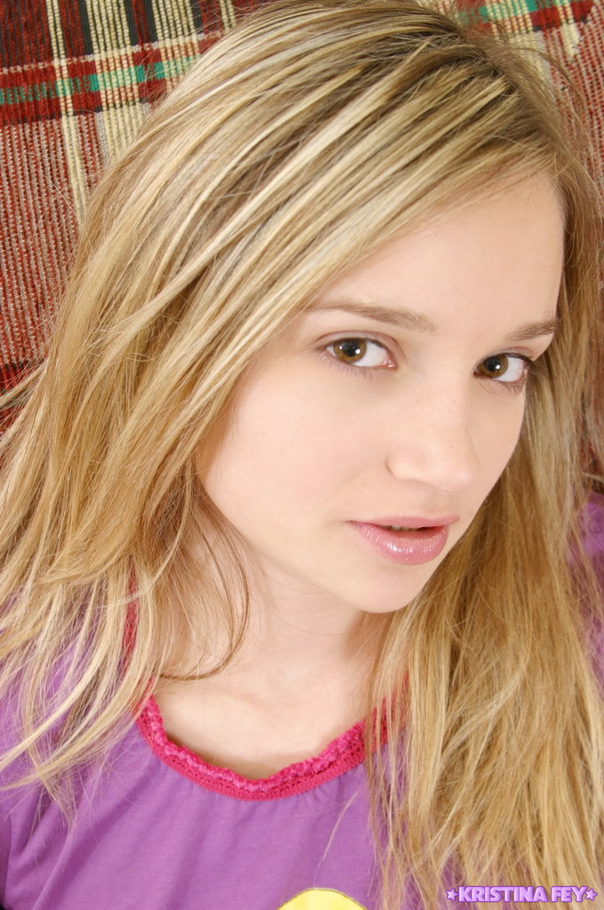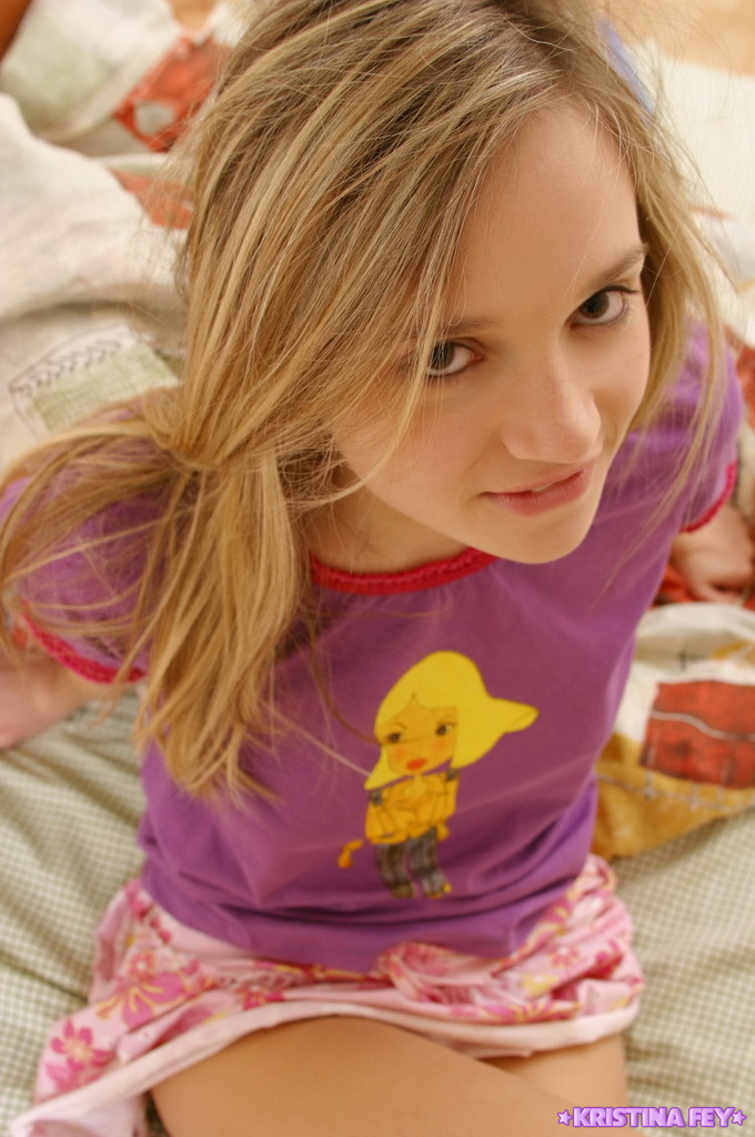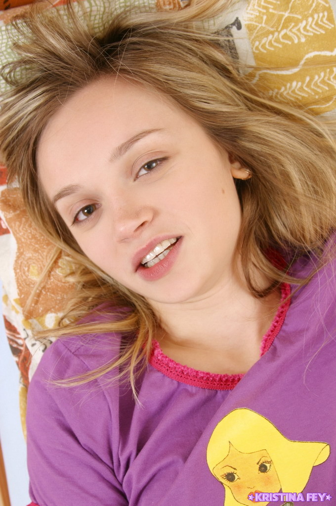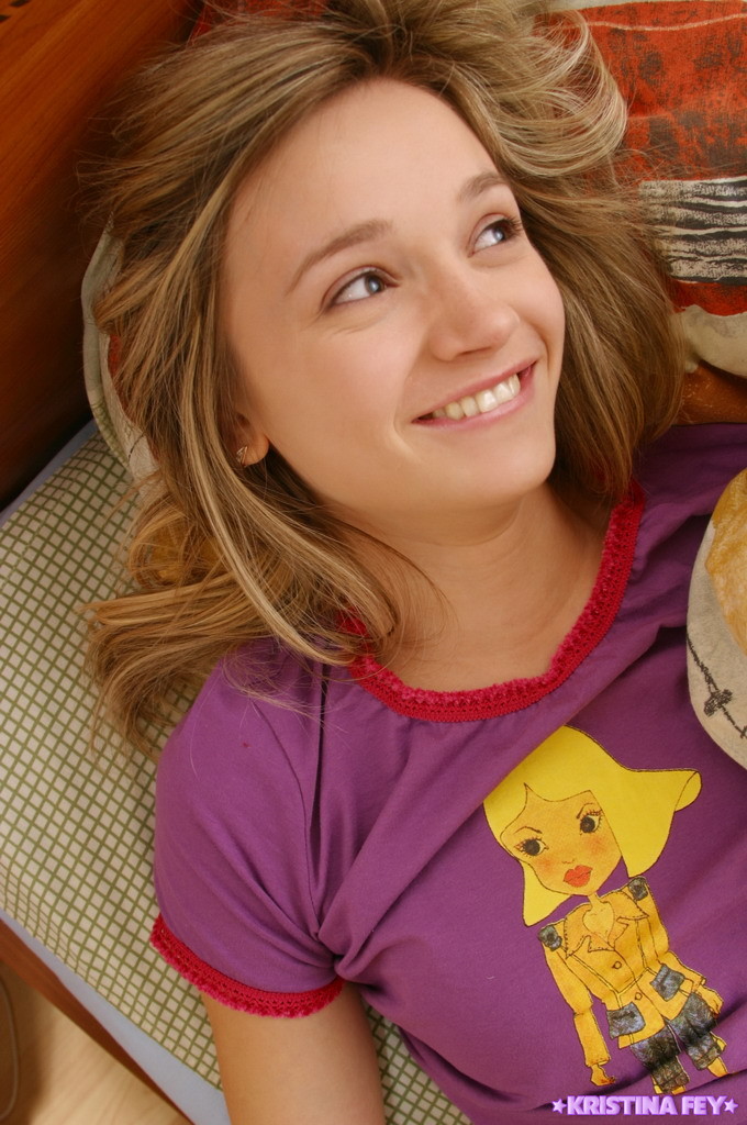 Beautiful blonde model Kristina Fey strips her underwear and shows her teen body.