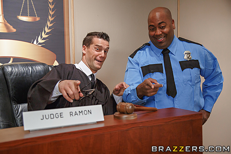 Kinky brunette goes to court just to takes off her clothes in the courtroom and serve two dicks