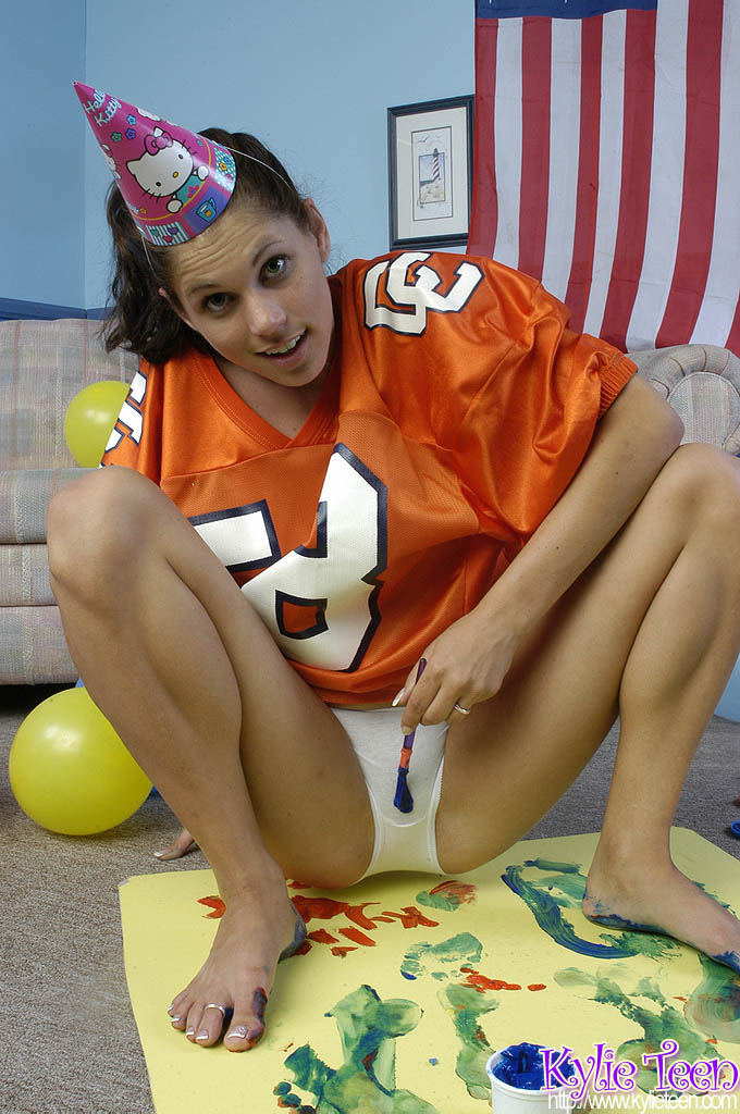 Lusty teen babe Kylie Rachelle takes off her shirt and unveils her perky boobs.