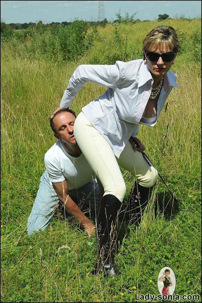 Lady Sonia takes her hot riding pants off outdoors and tortures her slave outdoors.