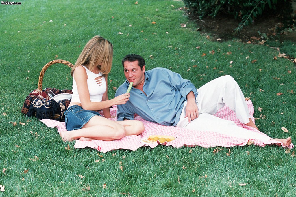 Slutty blonde gal Lisa Marie strips on the field and blows throbbing fat dong.