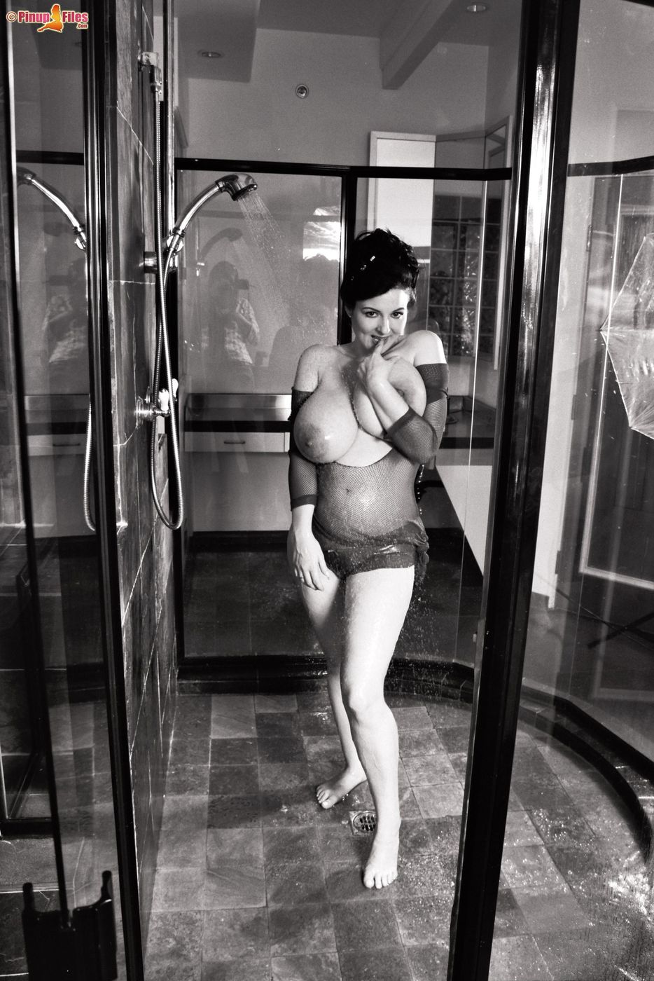 Busty brunette Lorna Morgan revealing her massive whoopers under the shower.