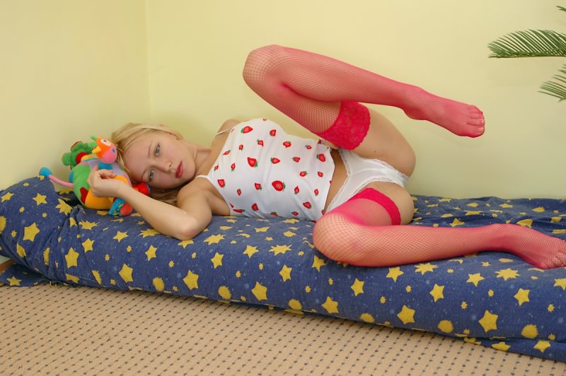 Slutty teen chick Lovely Anne teases us on the bed wearing lingerie and stockings.