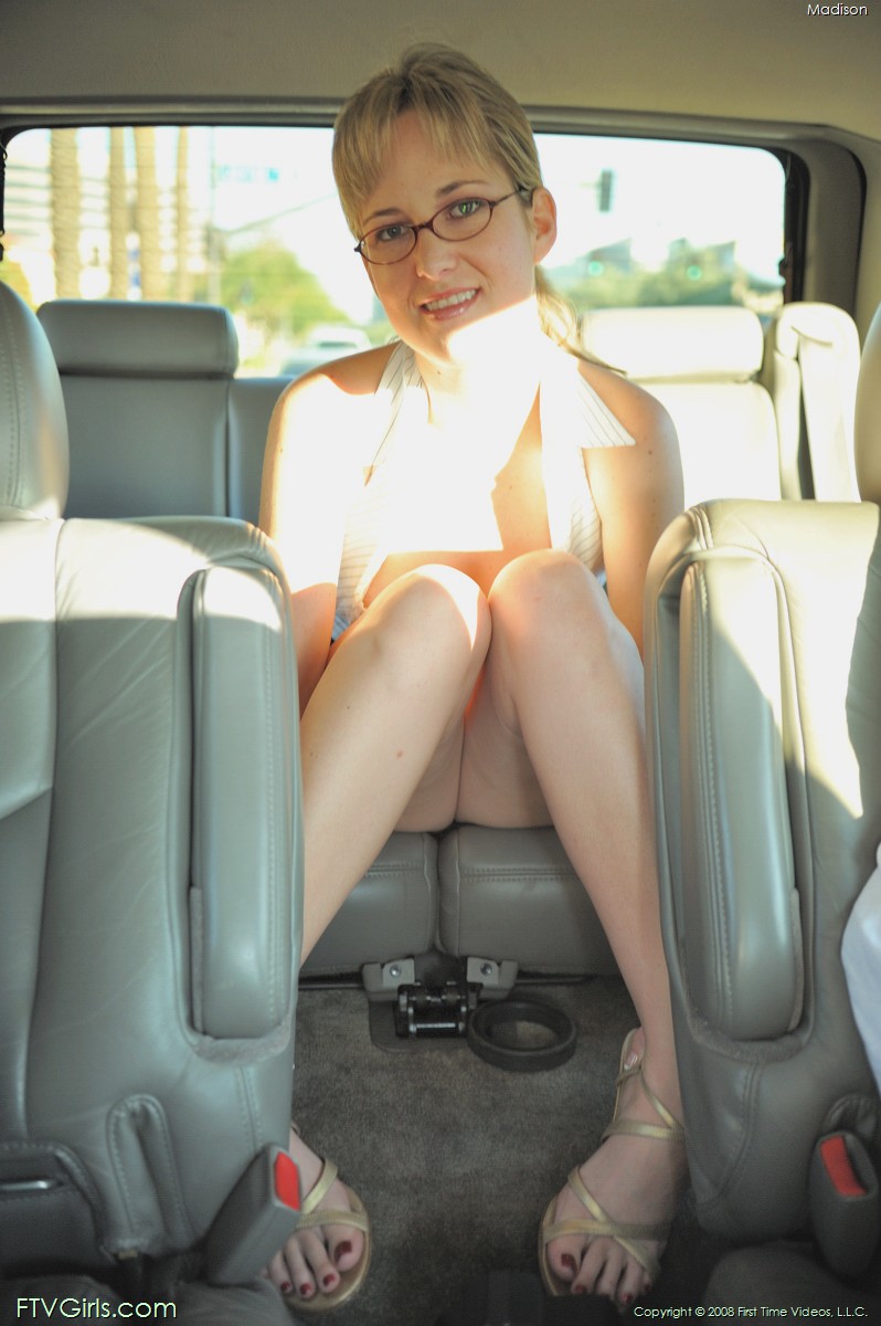 Seductive Madison FTV plays with her clean shaved pussy while riding in a posh car.