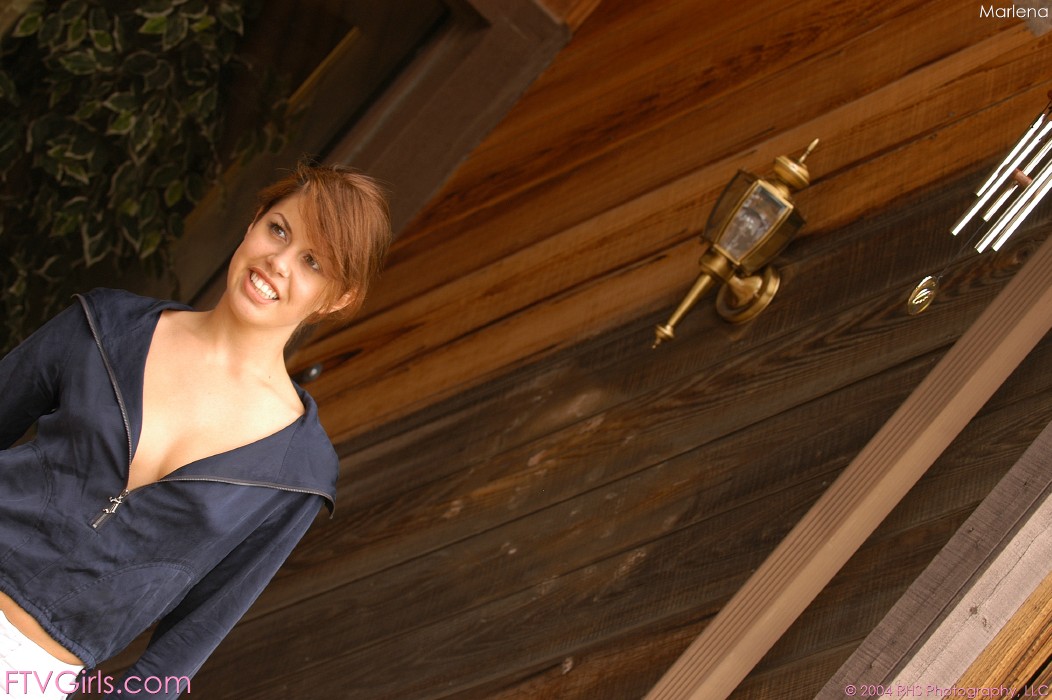 Beautiful redhead chick Marlena FTV strips her clothes outdoors and masturbates.
