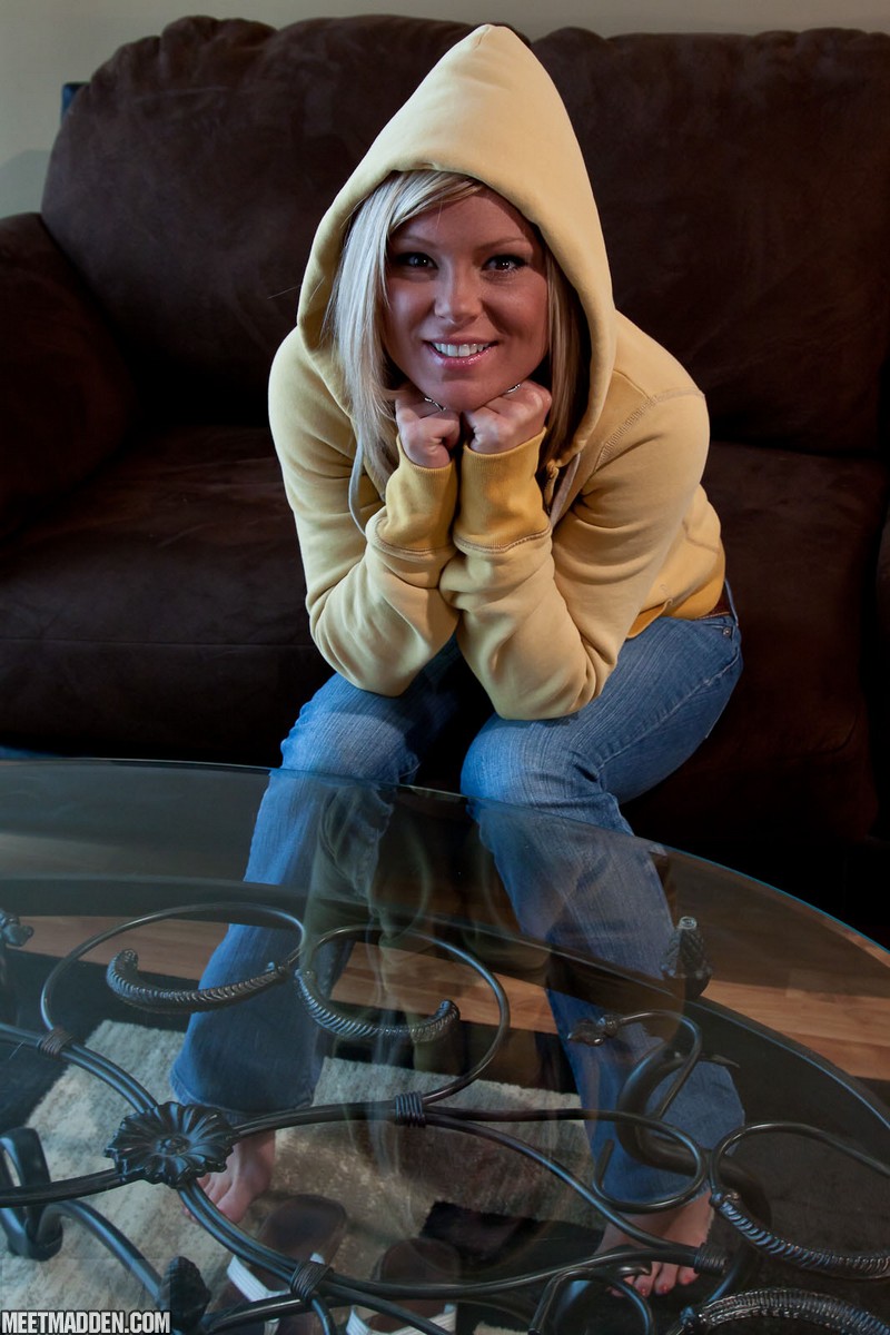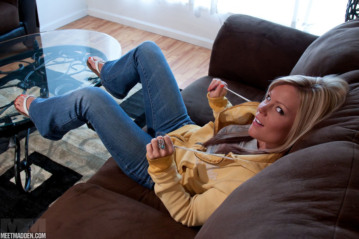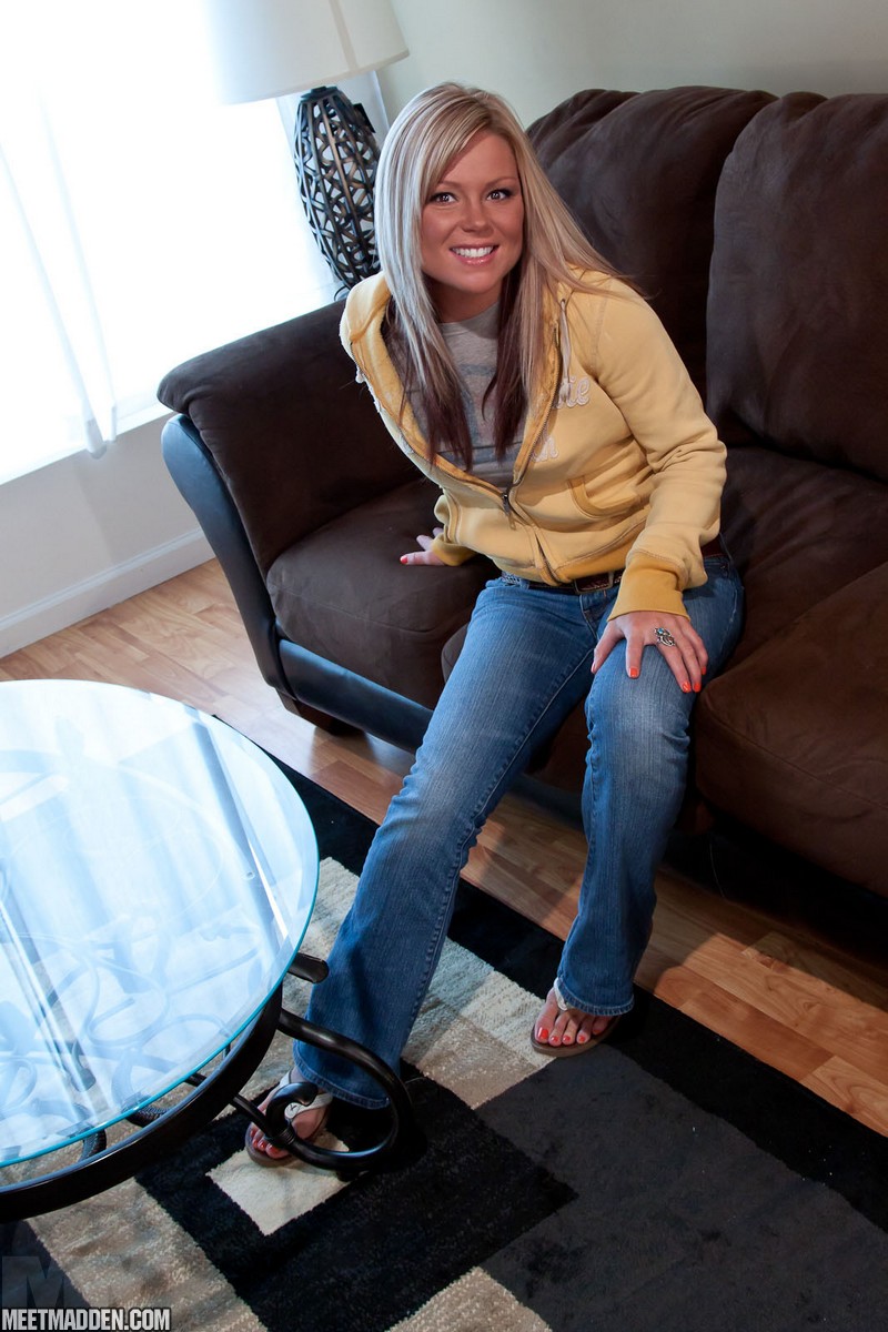 Cute blonde teen Meet Madden strips her clothes and shows us her big bouncy jugs.