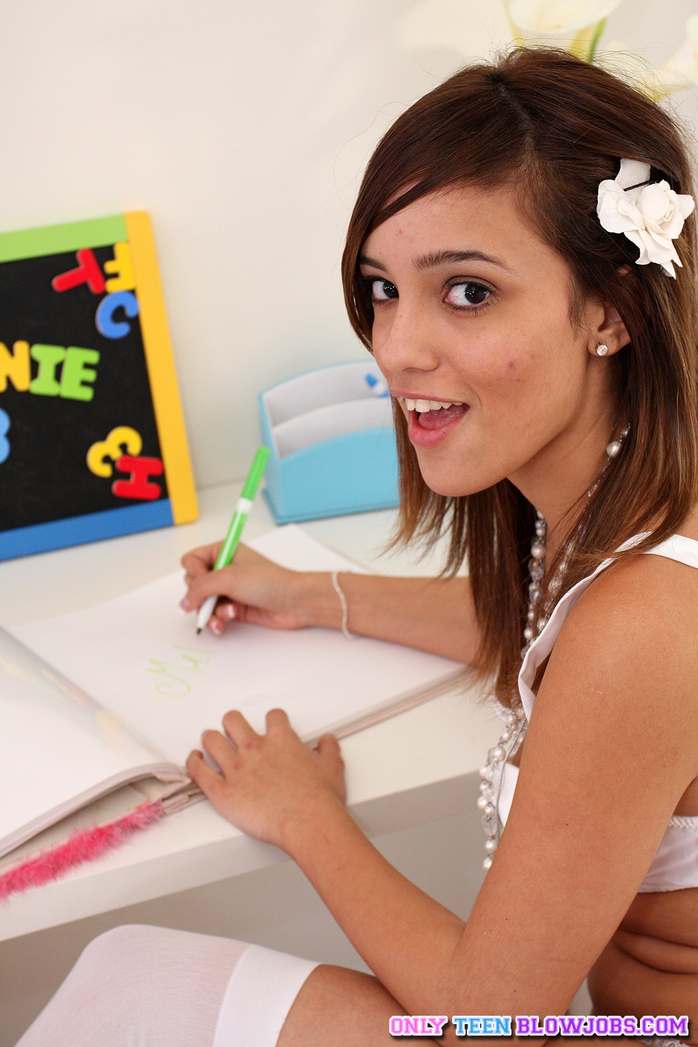 Beautiful gal Melanie Jane teases us on the bed in white lingerie and stockings.