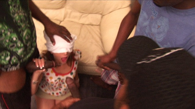 Mia Grey wears a blindfold while she orally pleases two horny hung black thugs.