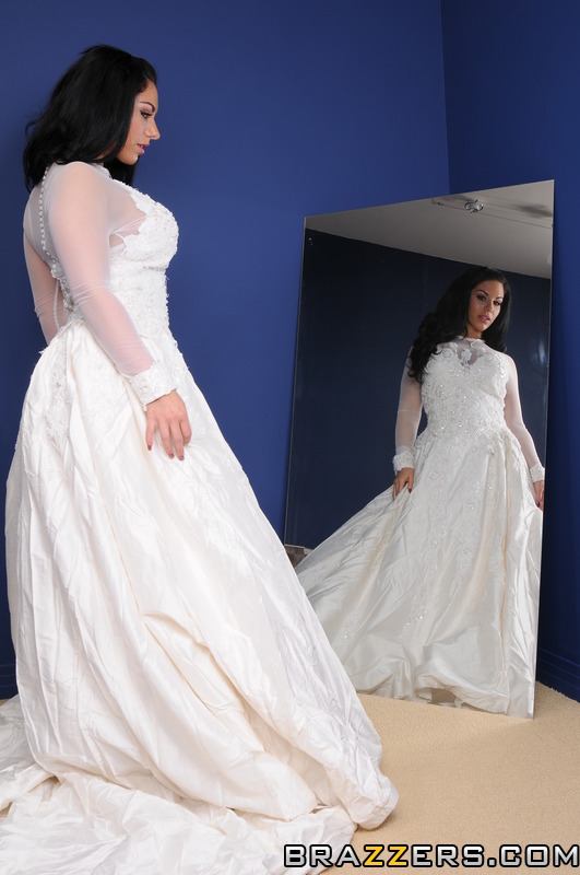 Luscious red haired hottie seduces a busty, raven haired gal dressed in a white dress.