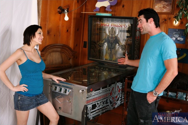 Mindy Main sucks hard on huge cock and takes off her clothes to get fucked on floor.