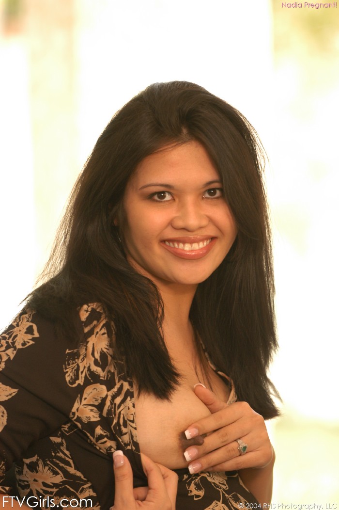 Hot teen preggy Nadia FTV takes off her white top and shows her massive milk cans.