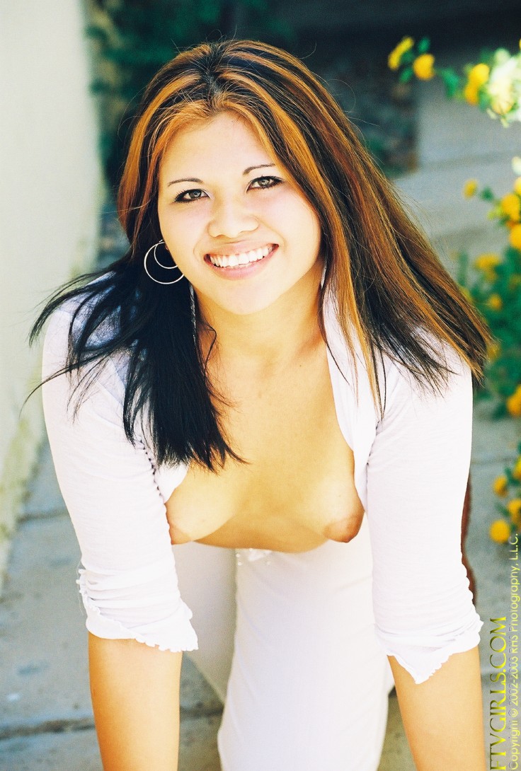 Foxy brunette model Nadia FTV strips her white outfit and shows us her perky boobs.