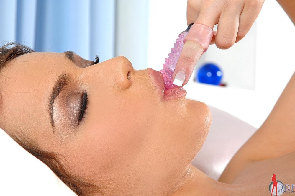 Horny brunette Natasha Nice fingerinf her hairy cunny with a small finger-dildo.