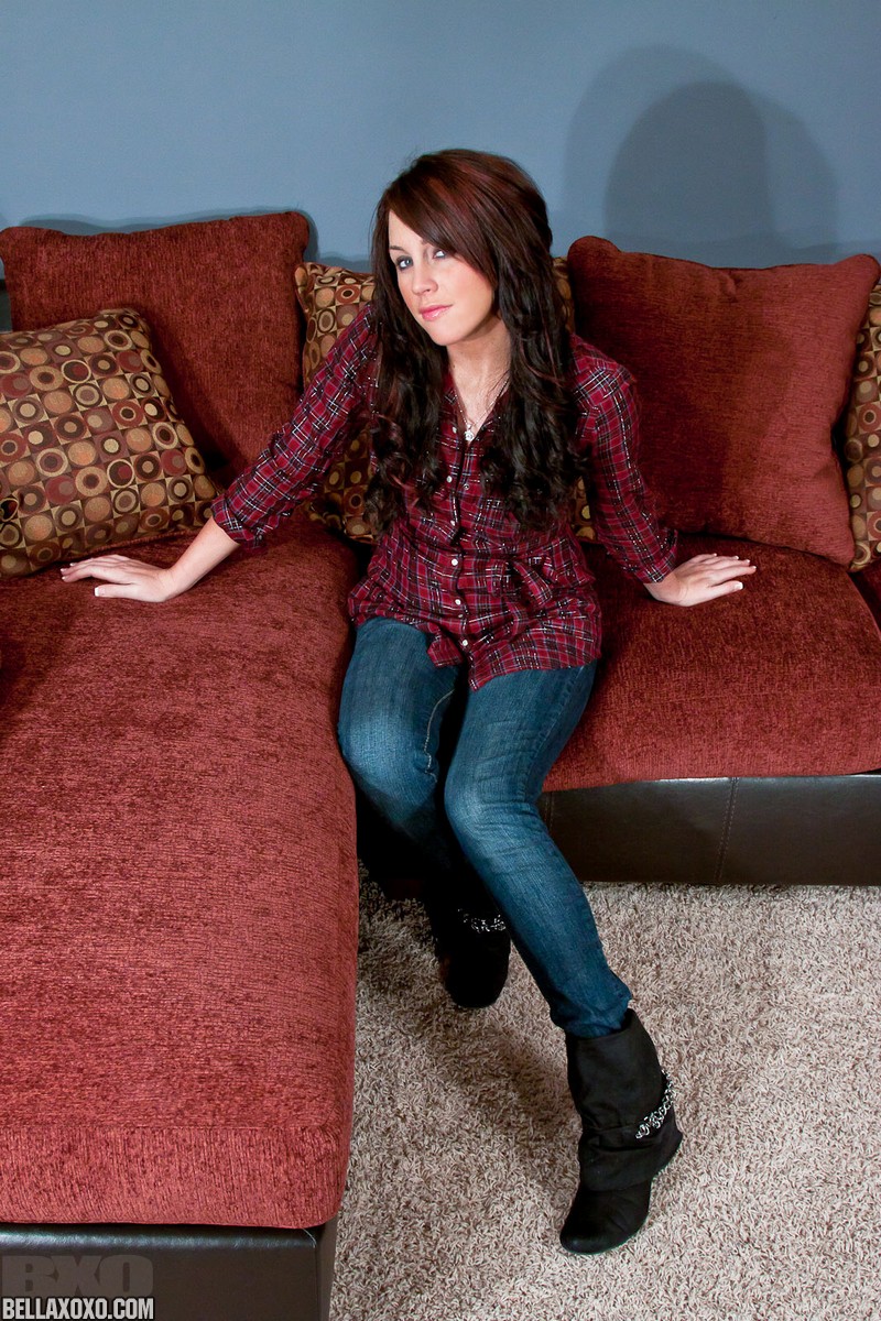 Alluring redhead babe Nikki Anne strips her blue jeans and shows her hot body.
