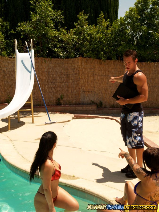 Horny brunette sluts Regan Reese and Luscious Lopez strip outdoors and share cock.