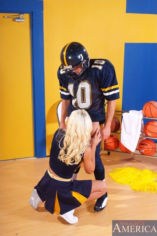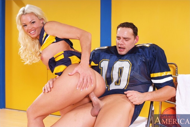 Rhylee Richards drops down her cheerleading uniform and gets a big cock up her cunt.