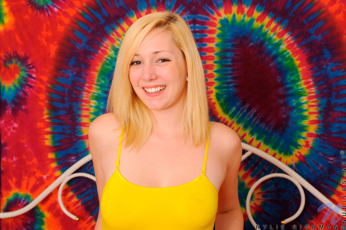 Beautiful blonde chick Rylie Richman strips her yellow lingerie and shows her cunt.