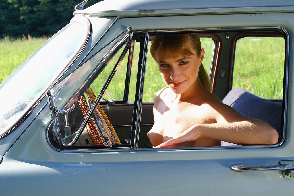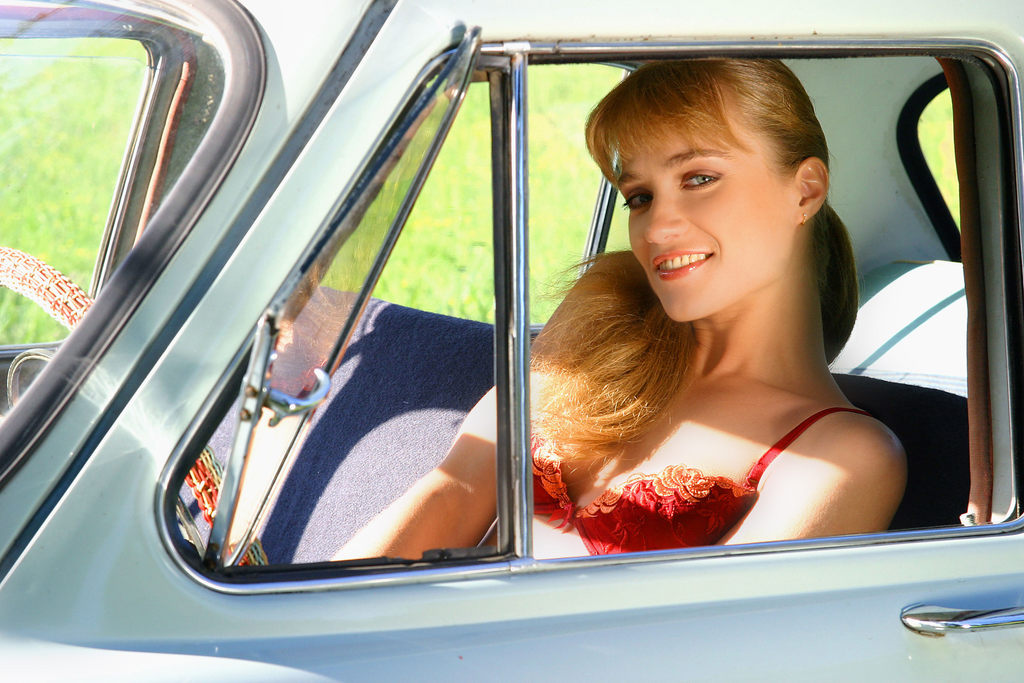 Sweet Sandra C performs a passionate striptease action in and on her favorite car.