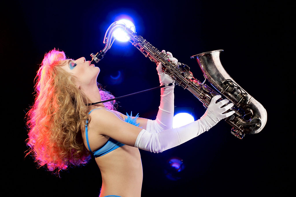 Seductive Sandra C plays saxophone and takes off her tiny outfit at the same time.