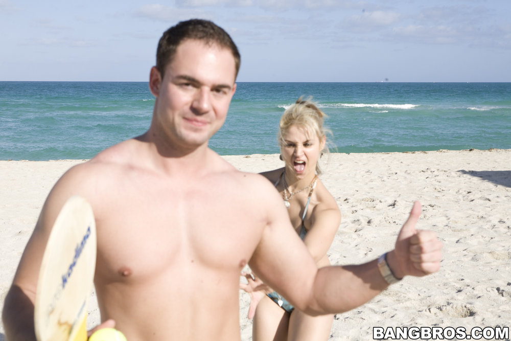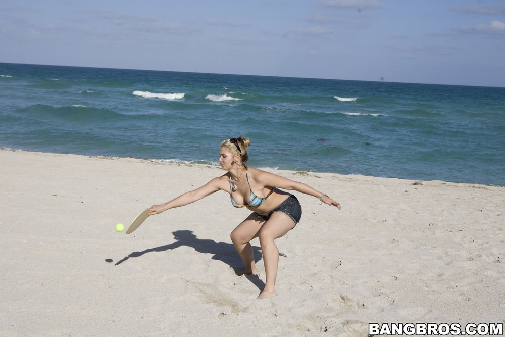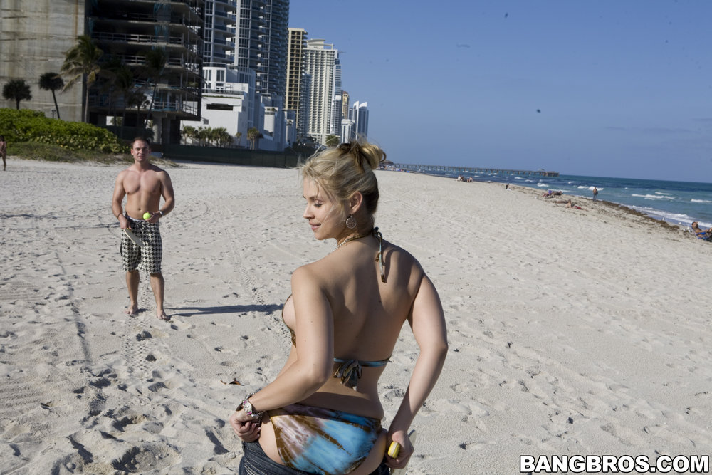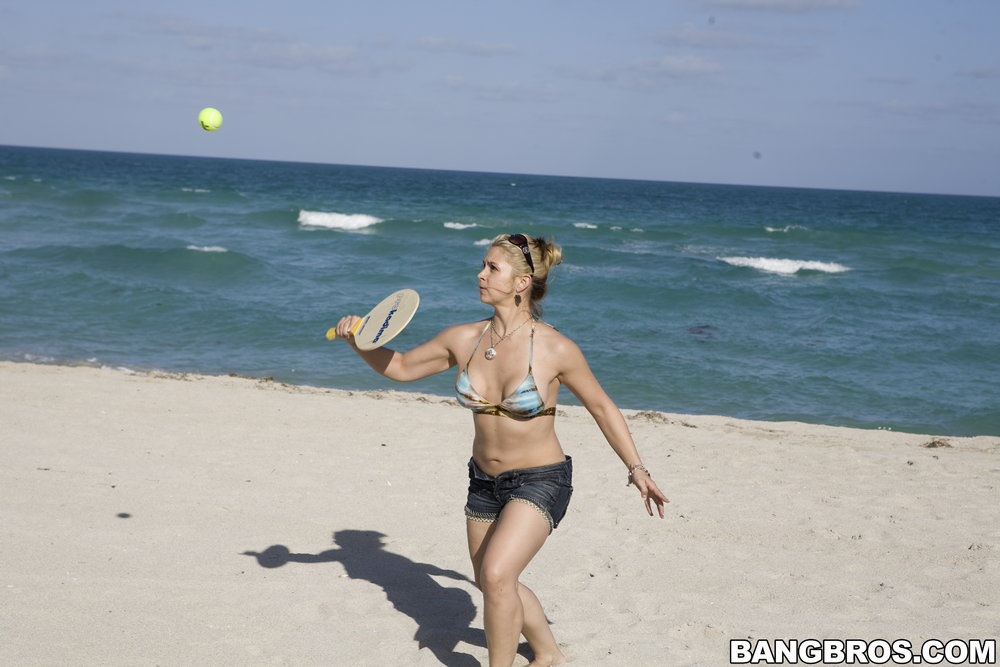 Sarah Vandella takes her clothes off on the beach and gets her fanny screwed hard.