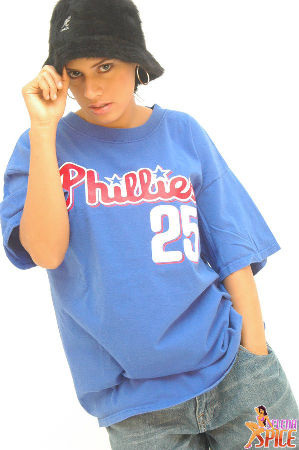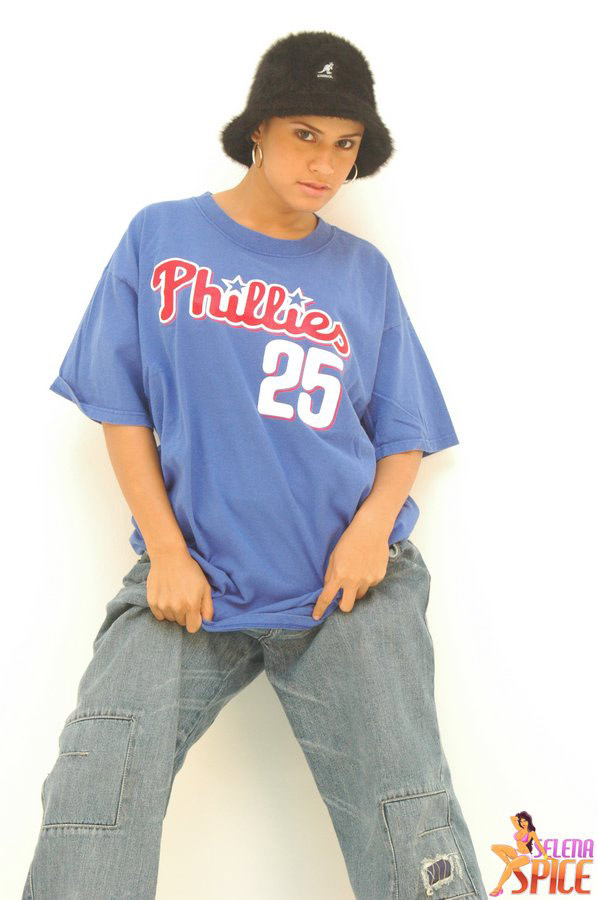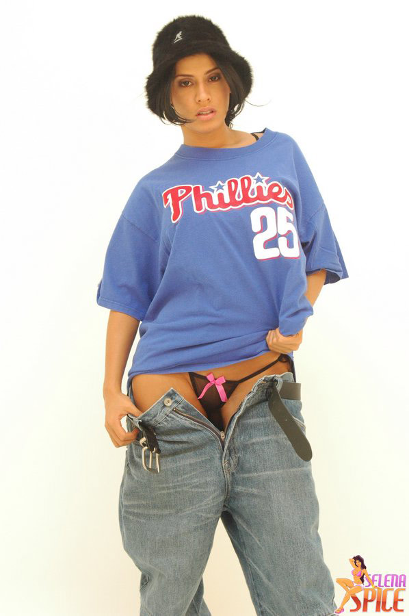 Attractive brunette gal Selena Spice takes off her jeans and teases in thongs.