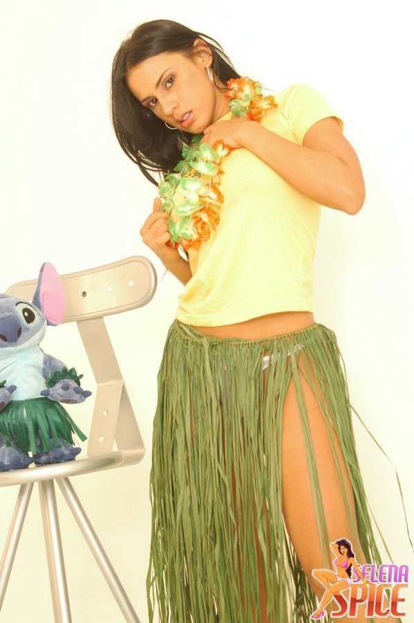 Busty tanned brunette Selena Spice with havaian skirt revealing sexy tushy in thong.