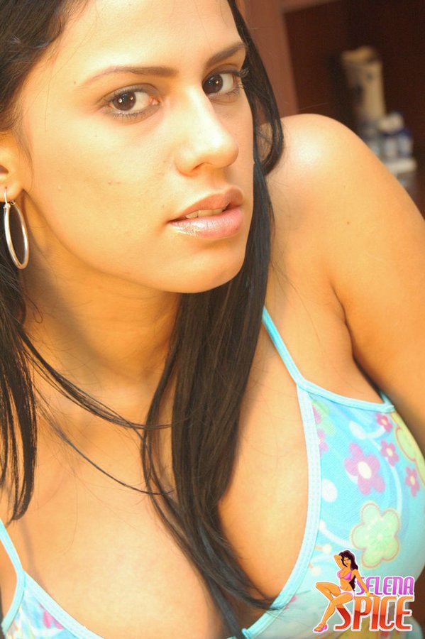 Sexy brunette with big titties Selena Spice revealing sexy booty in g-string.