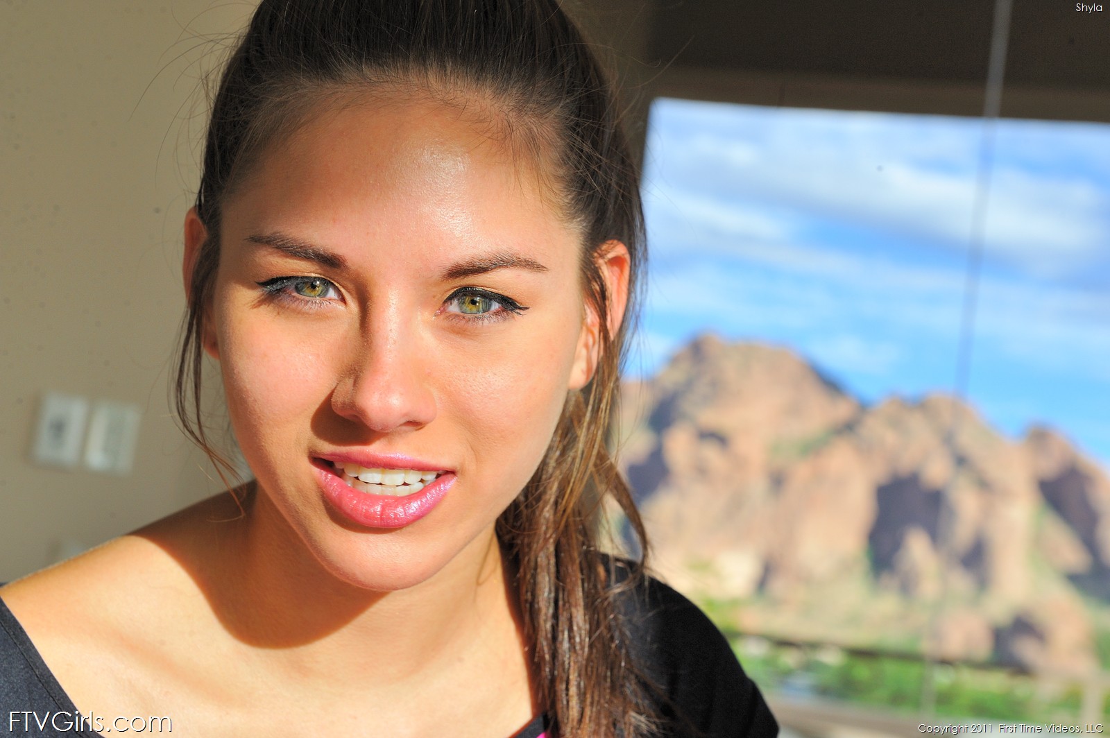 Shyla Jennings teases her little sweet pussy and pushes a banana deep inside it.