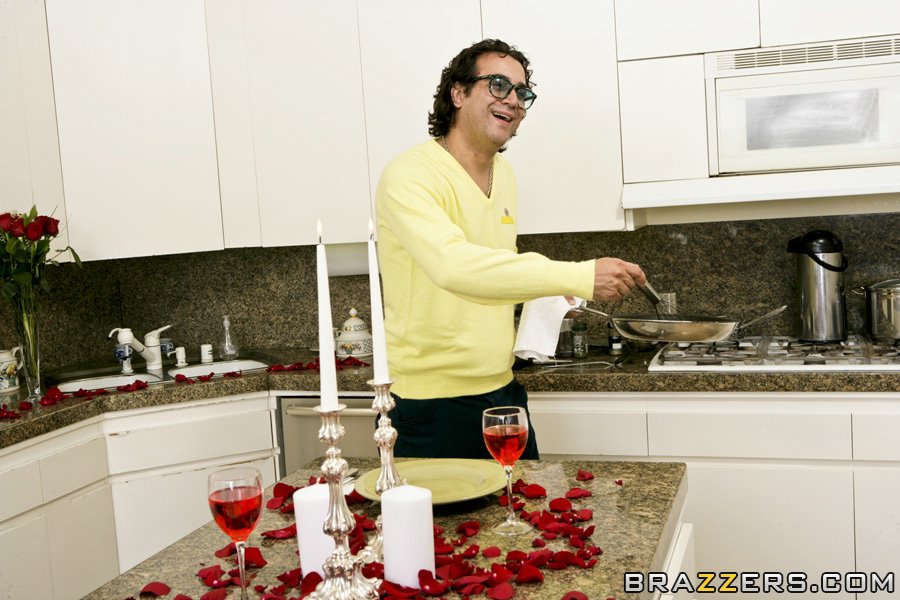 Shyla Stylez posing in her blue dress and gets her cunt fucked in the kitchen.