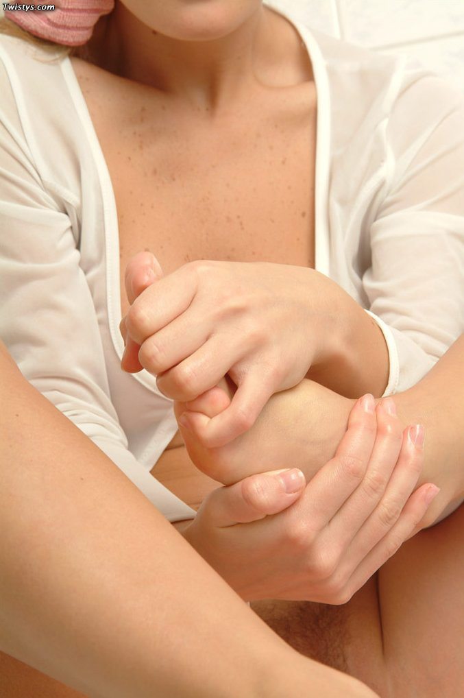 Hot blonde gal Silvie Thomas spreads her legs and plays with her trimmed vagina.