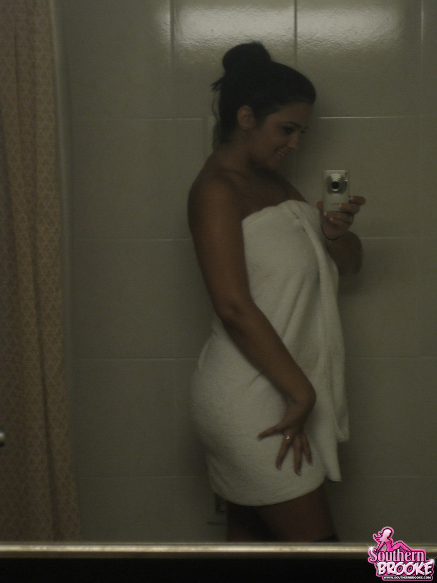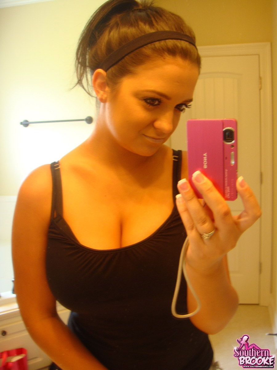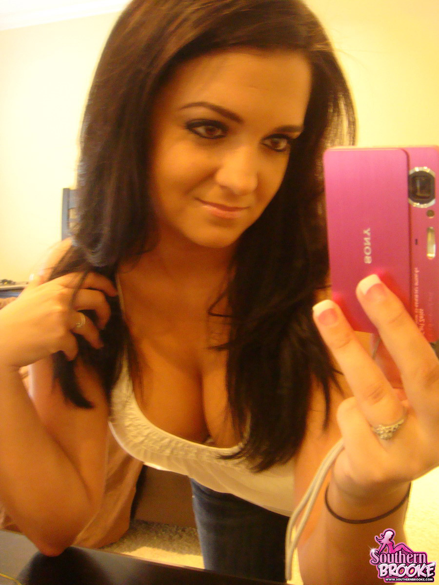 Busty brunette chick Southern Brooke takes hot pictures of her sexy cleveage.