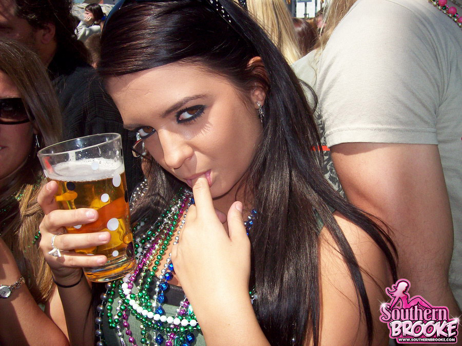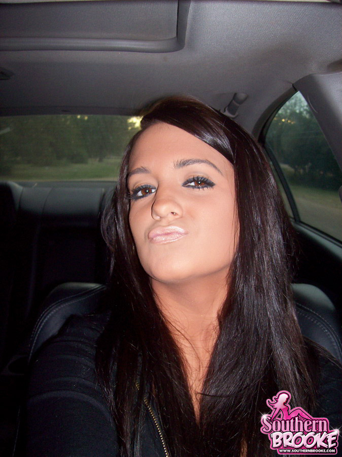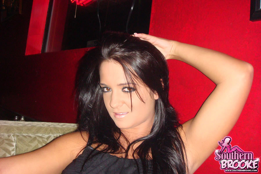 Busty brunette slut Southern Brooke takes off her clothes and shows her boobs.