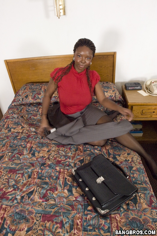 Black hottie, Stacy Adams, takes a white dick into her throat and clean shaved slit.