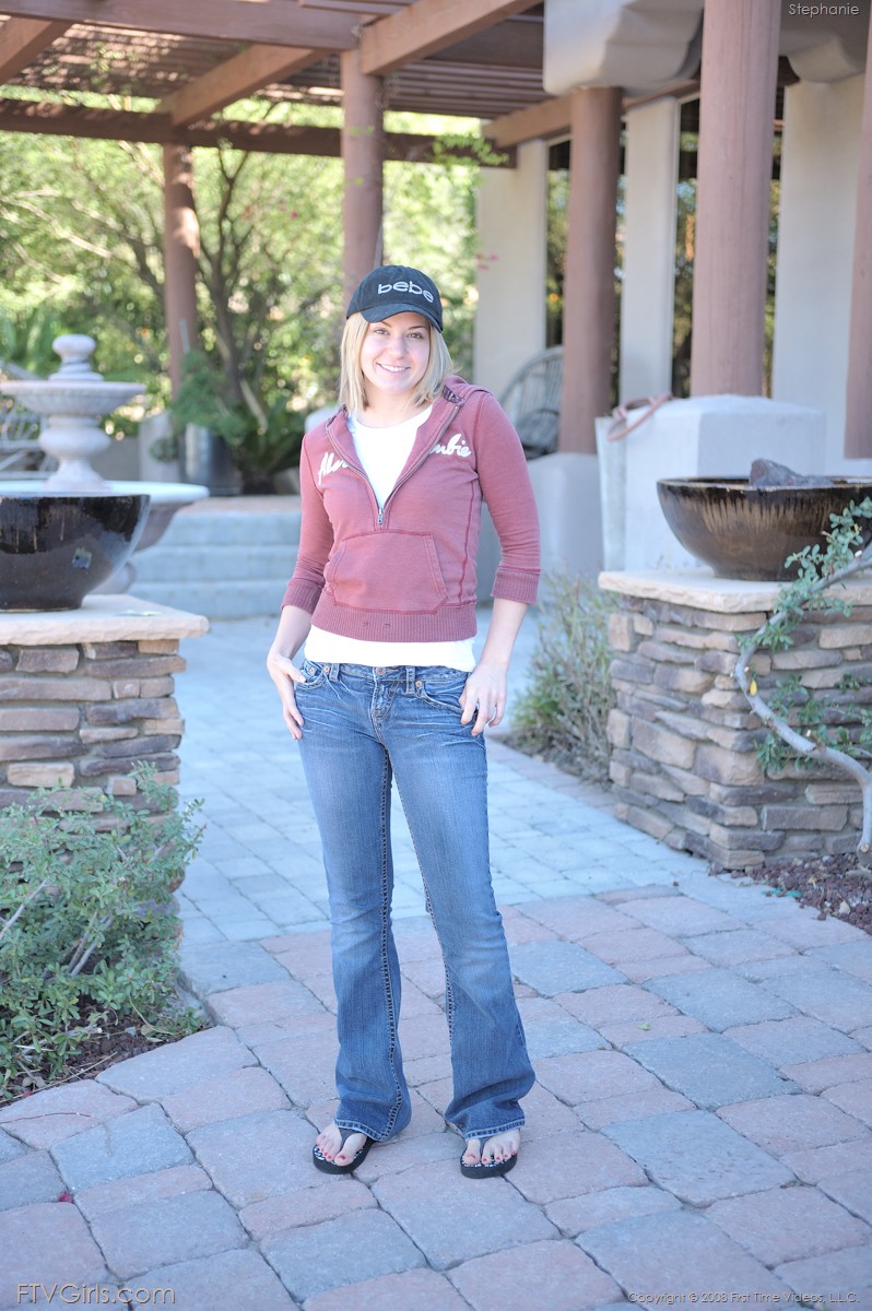 Attractive blonde Stephanie Sage with tight butt and small tits revealing shaved cunt.