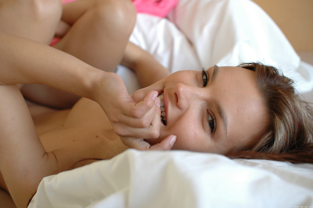 Suzie Carina takes her cute pink robe off and shows us her amazing teen body.