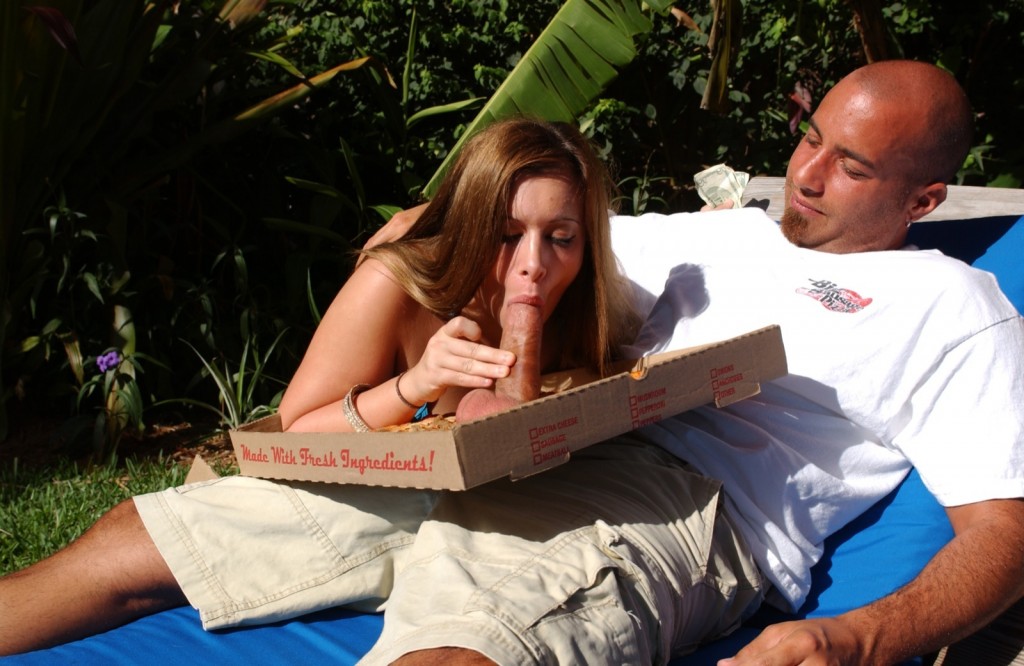 Vanessa Lee takes her bikini off for a pizza dude and rides his throbbing dong.