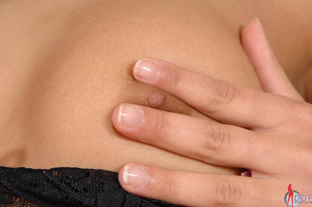 Sweet brunette Victoria Sweet with nice butt wearing black babydoll doing handjob.