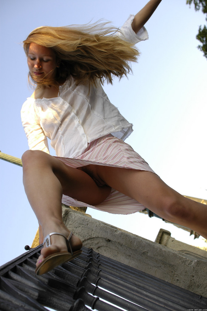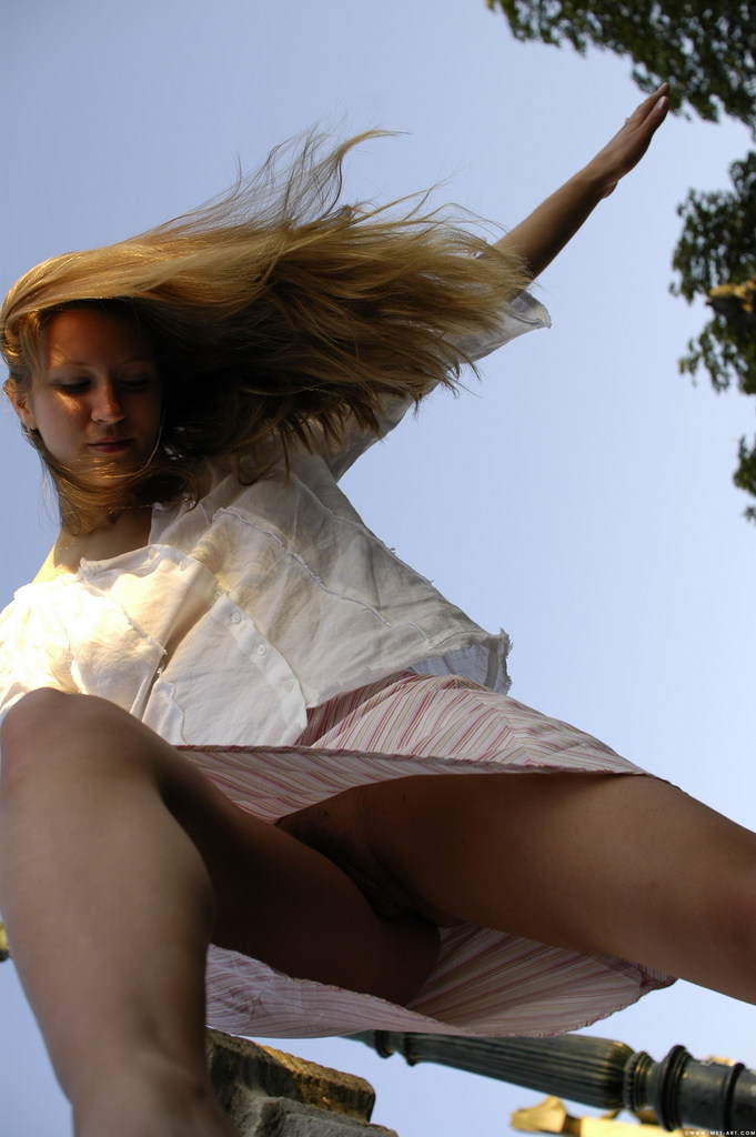 Yana B takes her sexy skirt outdoors and shows us her trimmed dripping pussy.
