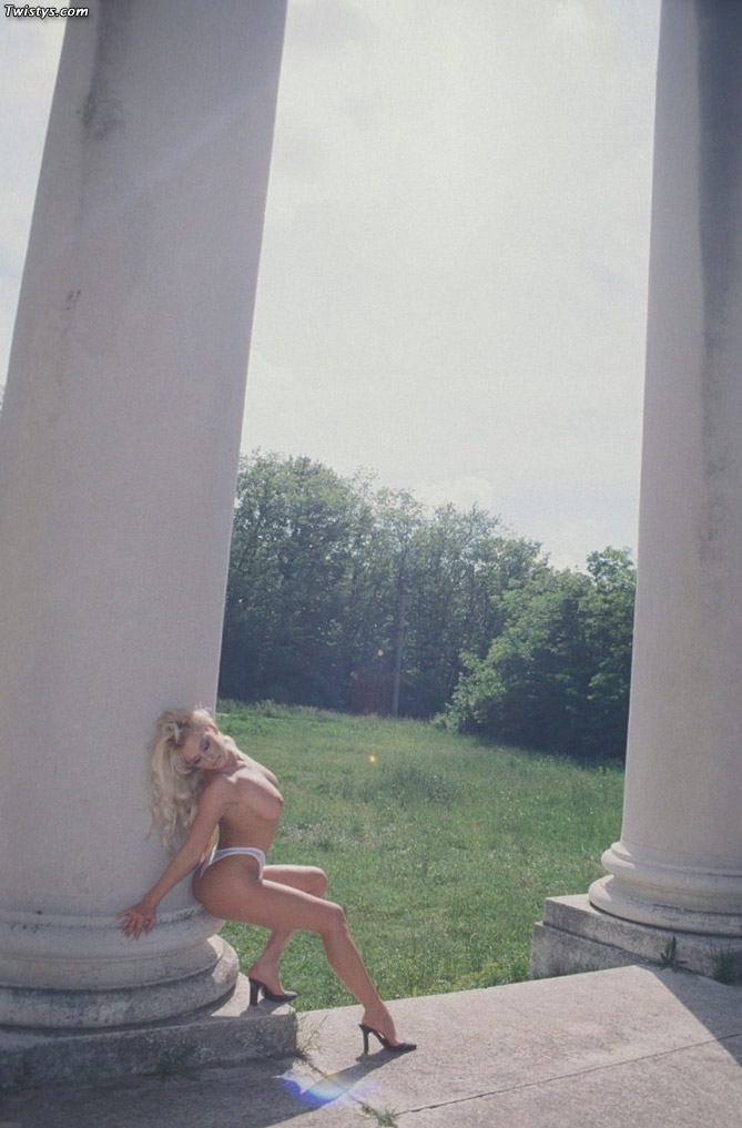 Zdenka Podkapova explores the neglected building and tries out several tight outfits.