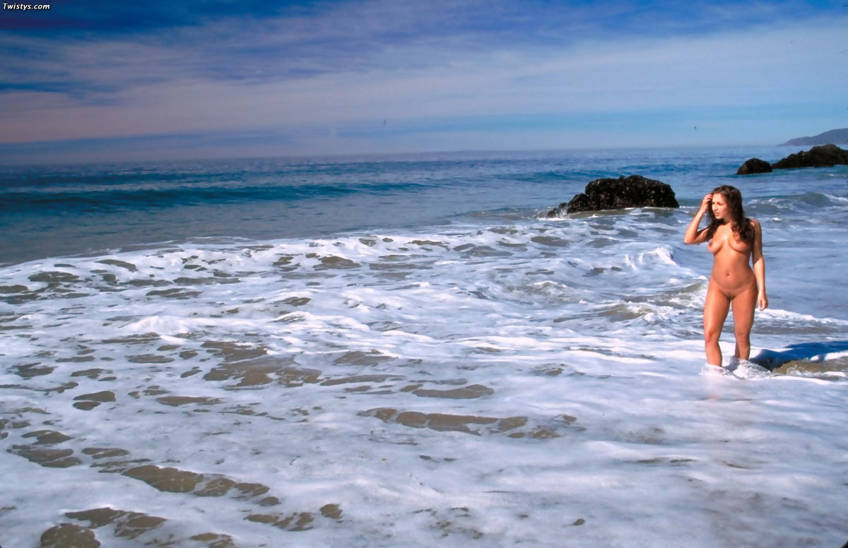 Smoking hot brunette babe Zoe Britton strips on the beach and shows her big jugs.
